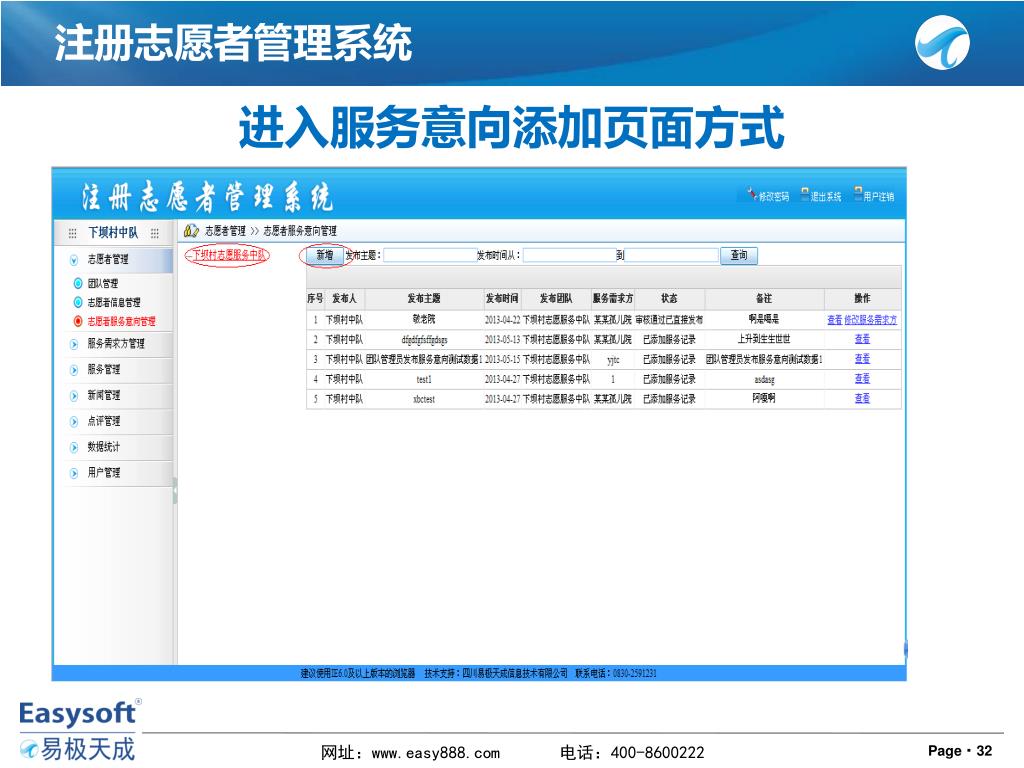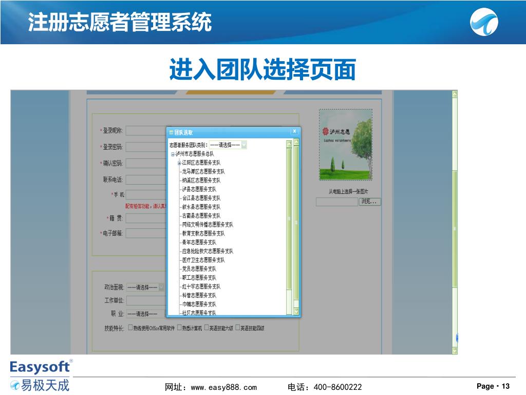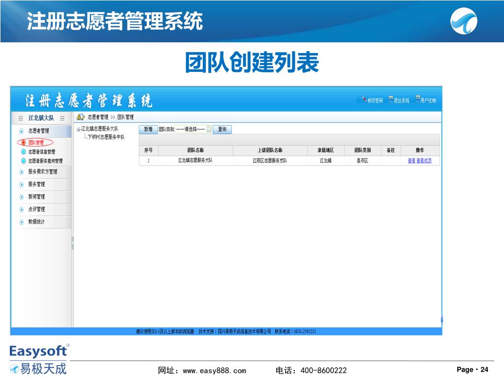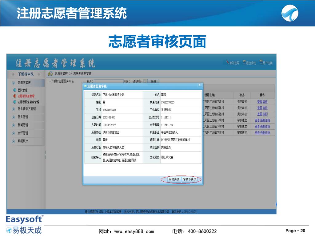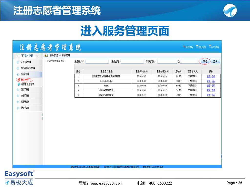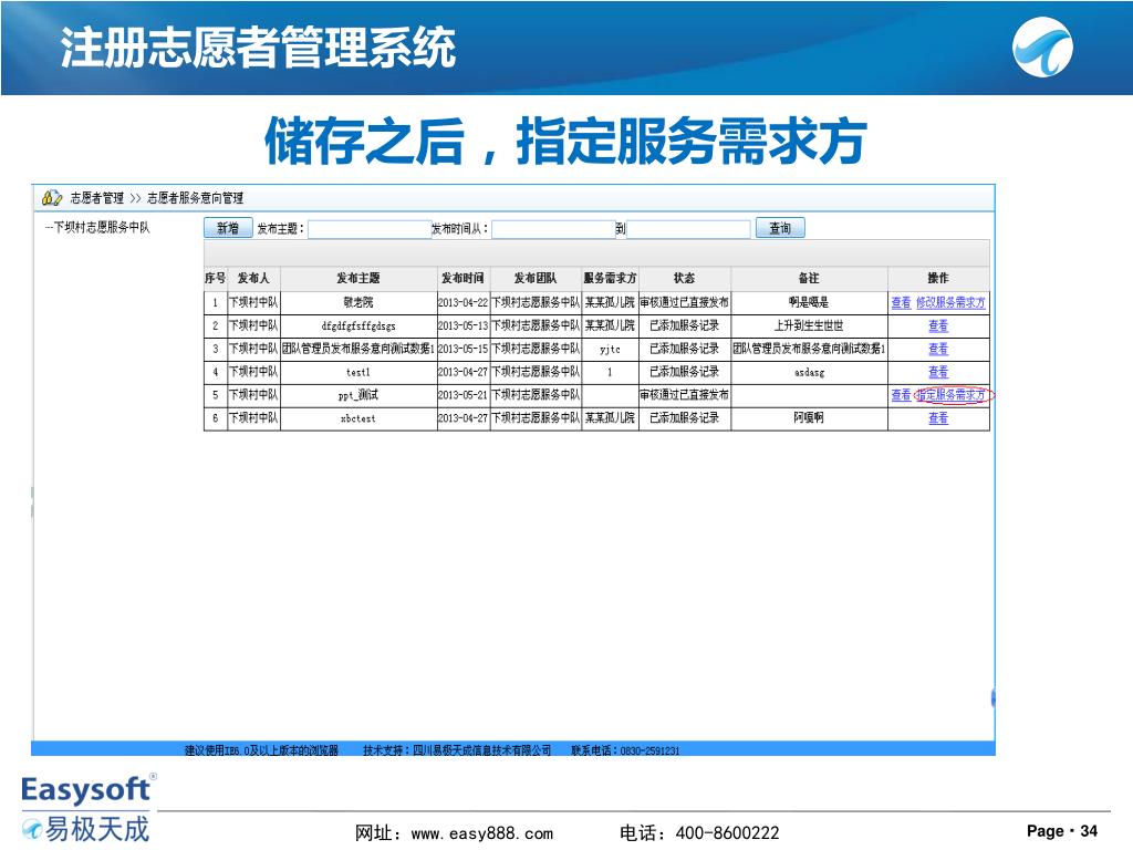 项目背景 项目背景 “泸州市注册志愿者信息管理系统”基于Web程序,建立一个管理全市注册志愿者的网络工作平台。系统整合新闻内容管理系统、志愿者活动管理系统、志愿者注册管理系统、志愿者团队管理系统、志愿者认证管理系统、志愿者服务时数管理系统、志愿者培训系统、志愿者统计分析系统、综合查询系统、志愿者服务交易管理、点评系统等。系统让社区、乡镇、区、有关部门和市志愿者管理者协同高效的工作,统一对全市的注册志愿者进行注册、认证和管理,能自动分行业、分类别、分区县、分乡镇、分社区统计汇总。通过这些系统模块实现无纸化、网络化、规范化管理,提高我市注册志愿者管理水平,提高志愿者为社会服务水平。