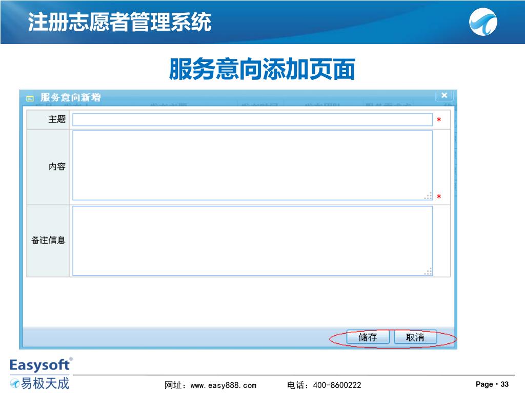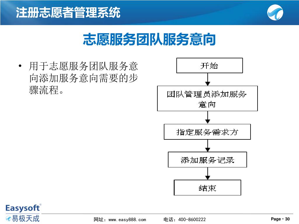 志愿服务团队服务意向 注册志愿者管理系统 • 用于志愿服务团队服务意向添加服务意向需要的步骤流程。