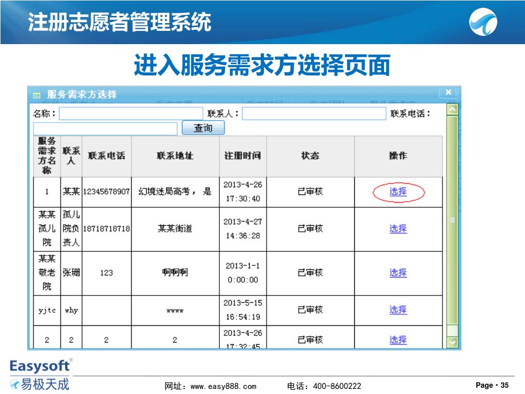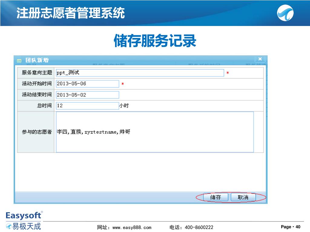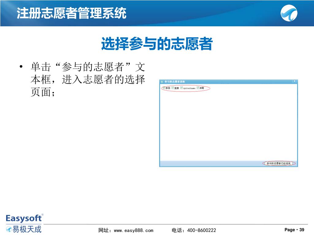 选择参与的志愿者 注册志愿者管理系统 • 单击“参与的志愿者”文本框,进入志愿者的选择页面;