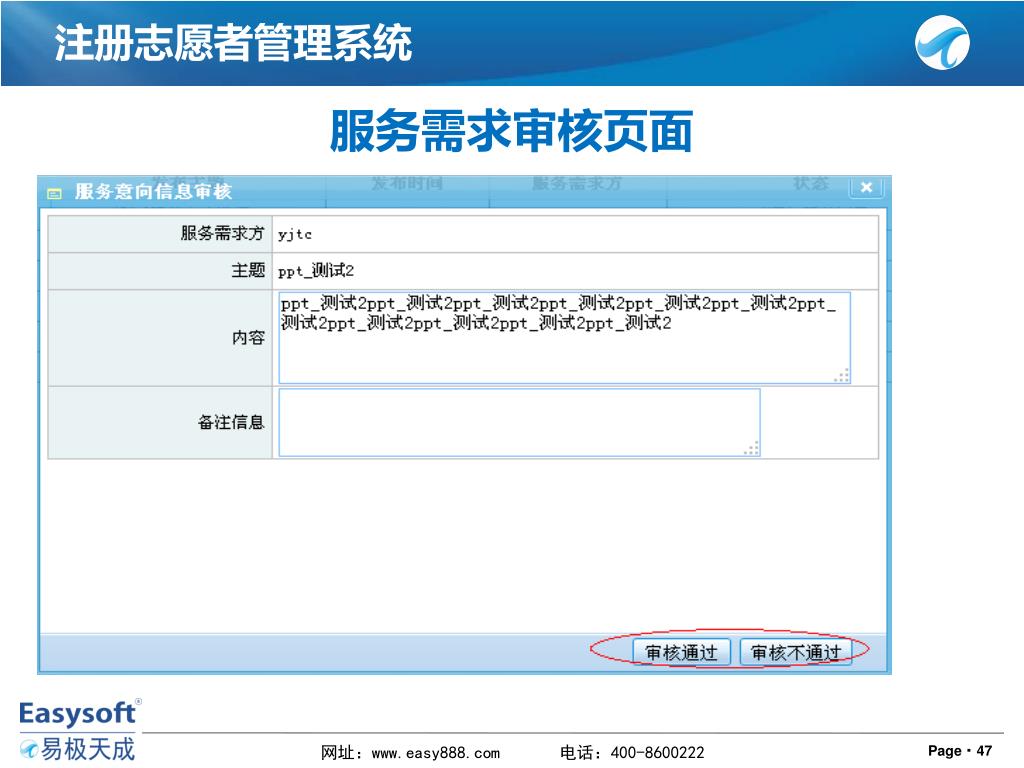 审核不通过 注册志愿者管理系统 • 确定之后,申请人自己修改相关信息,再提交进行审核;