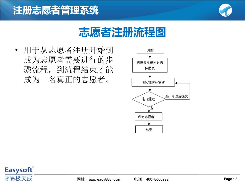 志愿者注册流程图 注册志愿者管理系统 • 用于从志愿者注册开始到成为志愿者需要进行的步骤流程,到流程结束才能成为一名真正的志愿者。