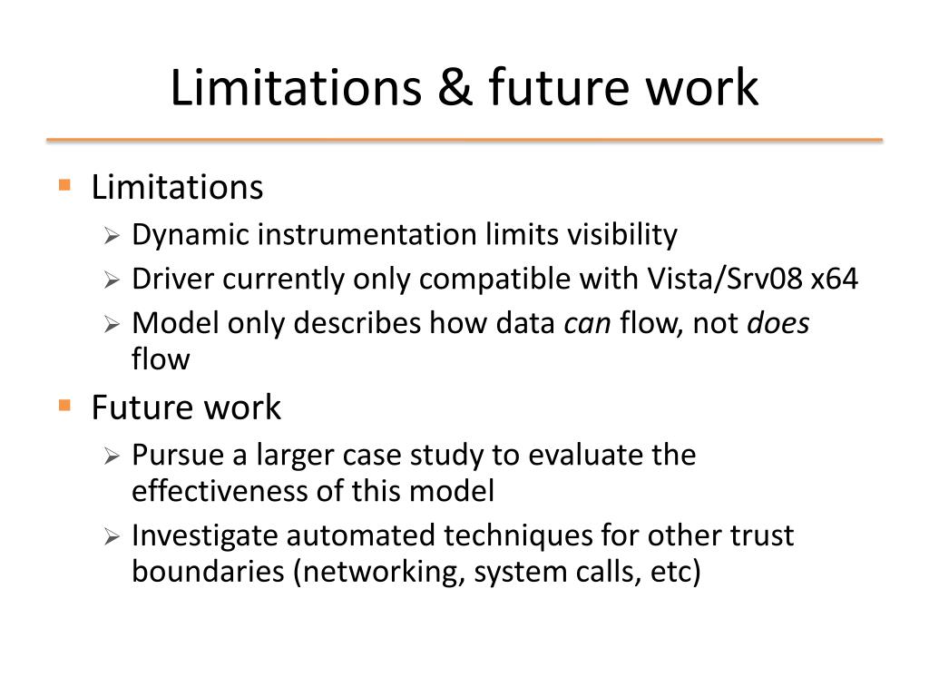 Limitations & future work • Limitations • Dynamic instrumentation limits visibility • Driver currently only compatible with Vista/Srv08 x64 • Model only describes how data can flow, not does flow • Future work • Pursue a larger case study to evaluate the effectiveness of this model • Investigate automated techniques for other trust boundaries (networking, system calls, etc)