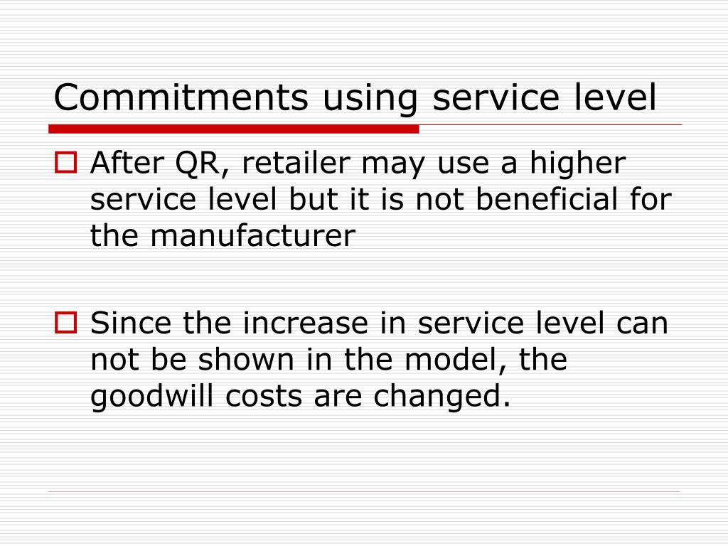 Commitments using service level • After QR, retailer may use a higher service level but it is not beneficial for the manufacturer • Since the increase in service level can not be shown in the model, the goodwill costs are changed.