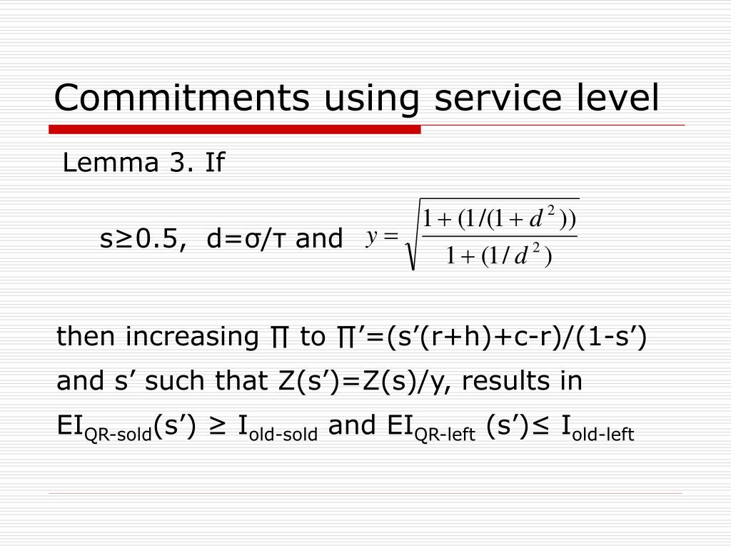 Commitments using service level Lemma 3. If s≥0.5, d=σ/τ and then increasing ∏ to ∏’=(s’(r+h)+c-r)/(1-s’) and s’ such that Z(s’)=Z(s)/y, results in EIQR-sold(s’) ≥ Iold-sold and EIQR-left (s’)≤ Iold-left