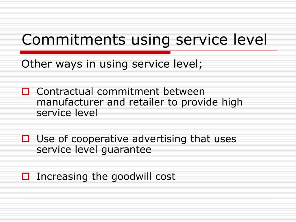 Commitments using service level Other ways in using service level; • Contractual commitment between manufacturer and retailer to provide high service level • Use of cooperative advertising that uses service level guarantee • Increasing the goodwill cost