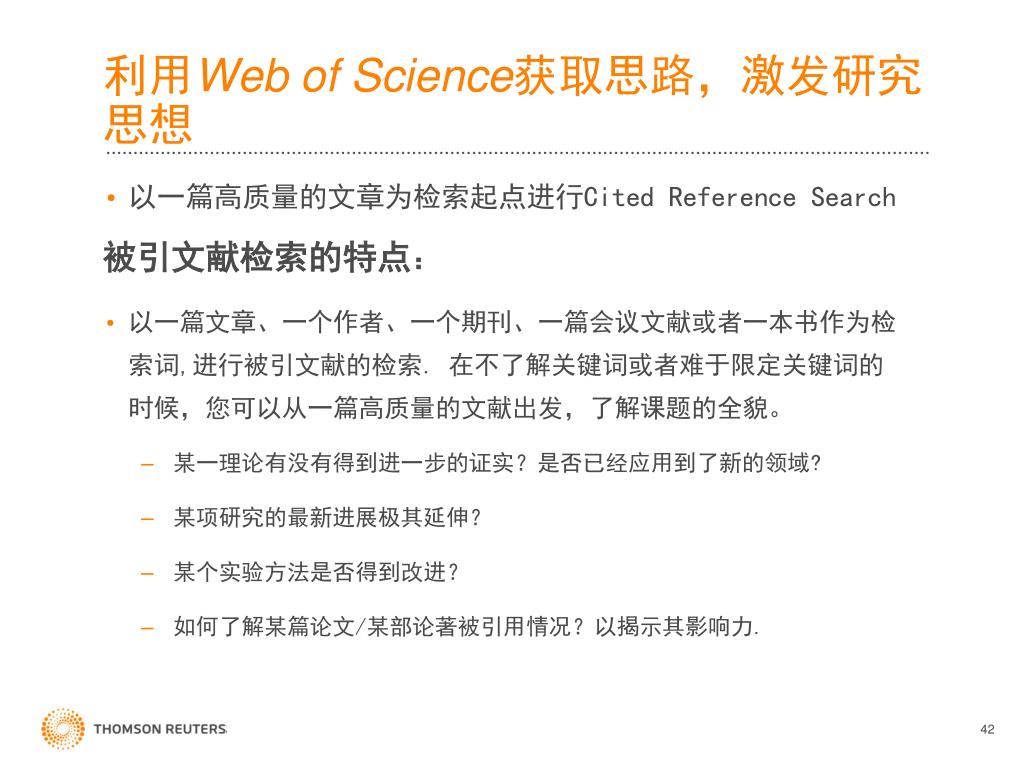 利用Web of Science获取思路,激发研究思想 • 以一篇高质量的文章为检索起点进行Cited Reference Search 被引文献检索的特点: • 以一篇文章、一个作者、一个期刊、一篇会议文献或者一本书作为检索词,进行被引文献的检索. 在不了解关键词或者难于限定关键词的时候,您可以从一篇高质量的文献出发,了解课题的全貌。 • 某一理论有没有得到进一步的证实?是否已经应用到了新的领域? • 某项研究的最新进展极其延伸? • 某个实验方法是否得到改进? • 如何了解某篇论文/某部论著被引用情况?以揭示其影响力.