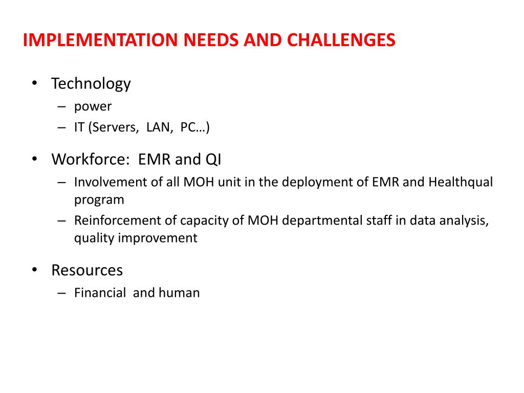 IMPLEMENTATION NEEDS AND CHALLENGES • Technology • power • IT (Servers, LAN, PC…) • Workforce: EMR and QI • Involvement of all MOH unit in the deployment of EMR and Healthqual program • Reinforcement of capacity of MOH departmental staff in data analysis, quality improvement • Resources • Financial and human