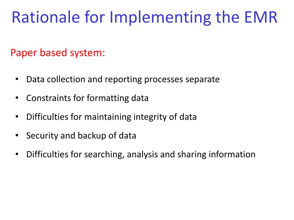 Data collection and reporting processes separate Constraints for formatting data Difficulties for maintaining integrity of data Security and backup of data Difficulties for searching, analysis and sharing information Rationale for Implementing the EMR Paper based system: