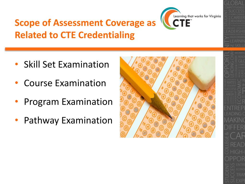 Scope of Assessment Coverage as Related to CTE Credentialing • Skill Set Examination • Course Examination • Program Examination • Pathway Examination