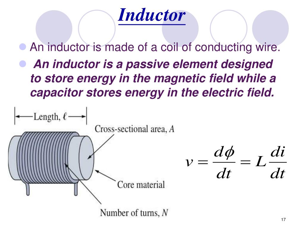 Inductor An inductor is made of a coil of conducting wire. An inductor is a passive element designed to store energyin the magnetic field while a capacitor stores energy in the electric field. 17