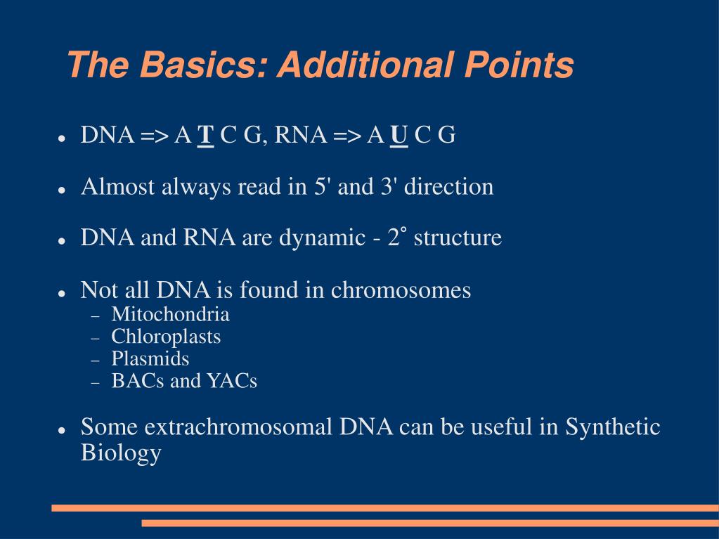 The Basics: Additional Points • DNA => A T C G, RNA => A U C G • Almost always read in 5' and 3' direction • DNA and RNA are dynamic - 2° structure • Not all DNA is found in chromosomes • Mitochondria • Chloroplasts • Plasmids • BACs and YACs • Some extrachromosomal DNA can be useful in Synthetic Biology