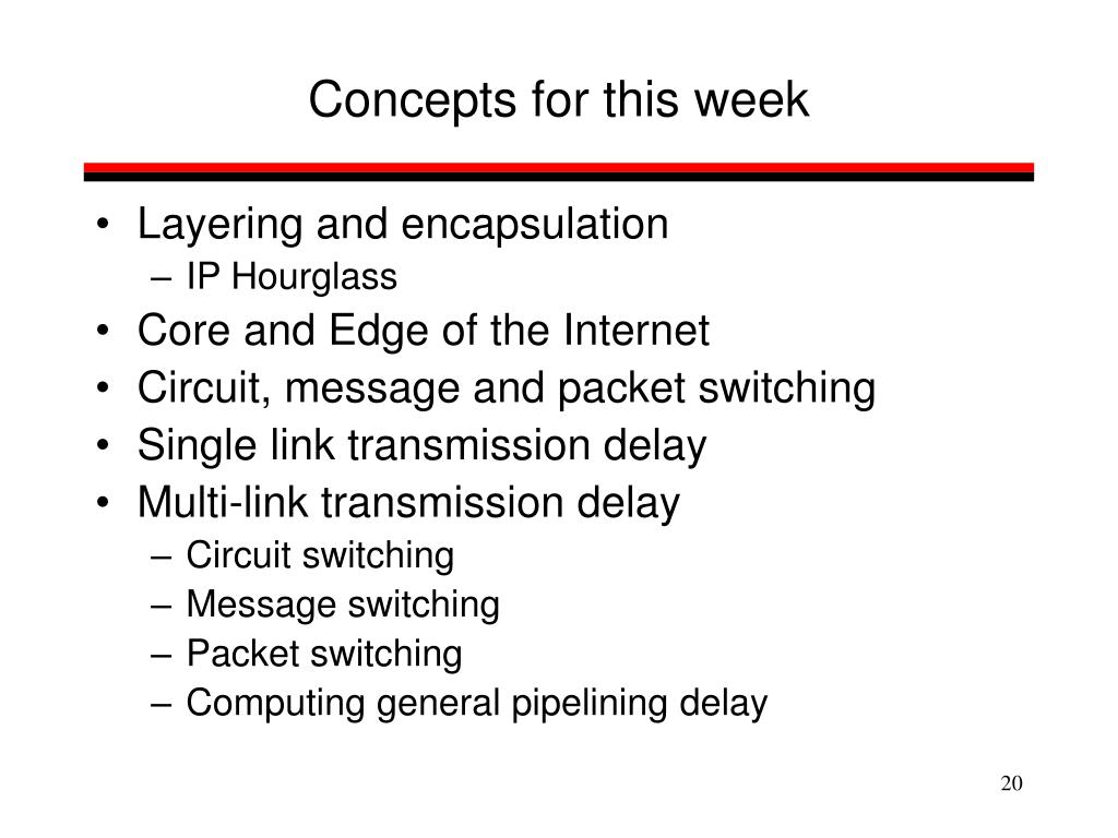 Concepts for this week • Layering and encapsulation • IP Hourglass • Core and Edge of the Internet • Circuit, message and packet switching • Single link transmission delay • Multi-link transmission delay • Circuit switching • Message switching • Packet switching • Computing general pipelining delay