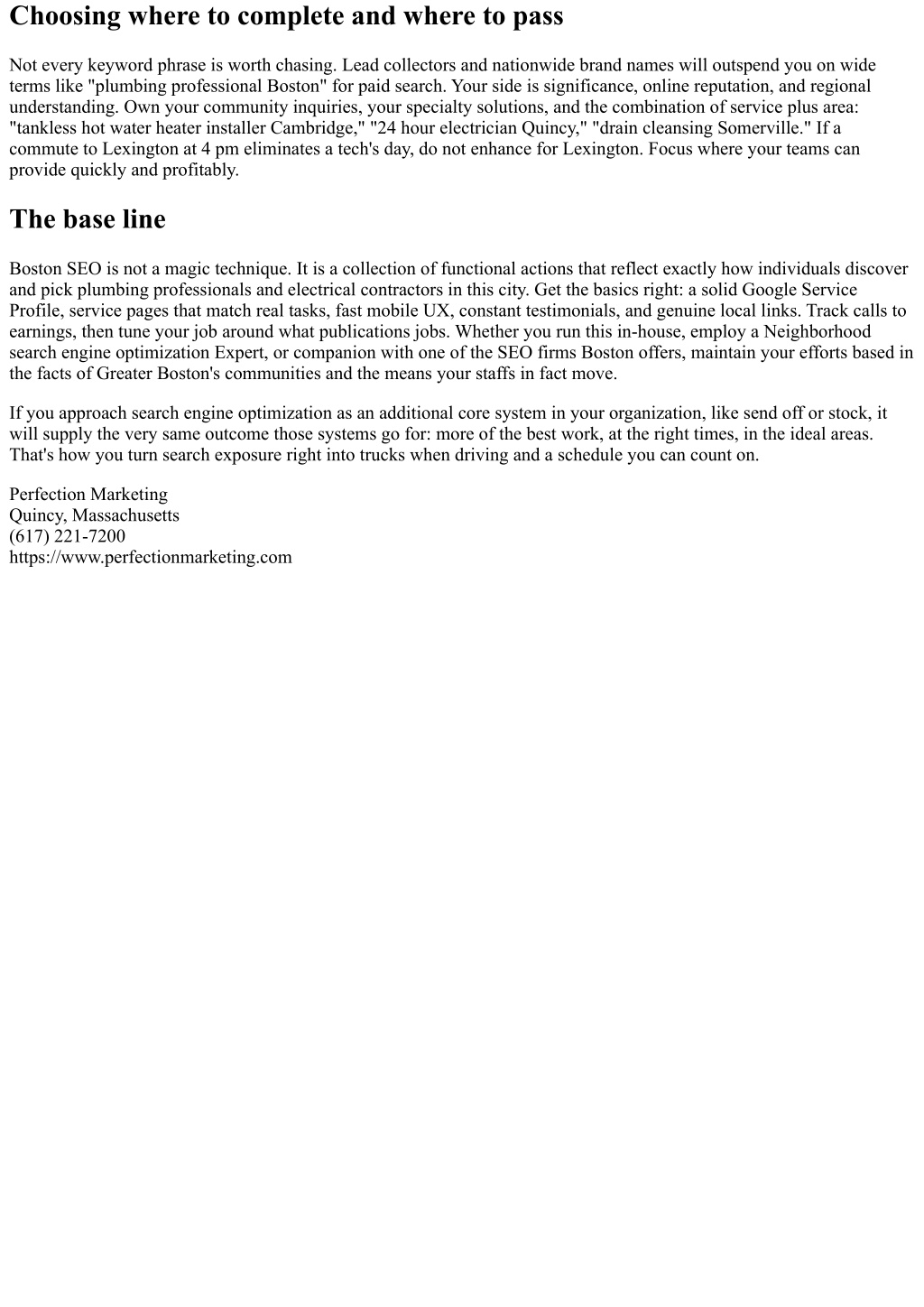 Choosing where to complete and where to pass Not every keyword phrase is worth chasing. Lead collectors and nationwide brand names will outspend you on wide terms like "plumbing professional Boston" for paid search. Your side is significance, online reputation, and regional understanding. Own your community inquiries, your specialty solutions, and the combination of service plus area: "tankless hot water heater installer Cambridge," "24 hour electrician Quincy," "drain cleansing Somerville." If a commute to Lexington at 4 pm eliminates a tech's day, do not enhance for Lexington. Focus where your teams can provide quickly and profitably. The base line Boston SEO is not a magic technique. It is a collection of functional actions that reflect exactly how individuals discover and pick plumbing professionals and electrical contractors in this city. Get the basics right: a solid Google Service Profile, service pages that match real tasks, fast mobile UX, constant testimonials, and genuine local links. Track calls to earnings, then tune your job around what publications jobs. Whether you run this in-house, employ a Neighborhood search engine optimization Expert, or companion with one of the SEO firms Boston offers, maintain your efforts based in the facts of Greater Boston's communities and the means your staffs in fact move. If you approach search engine optimization as an additional core system in your organization, like send off or stock, it will supply the very same outcome those systems go for: more of the best work, at the right times, in the ideal areas. That's how you turn search exposure right into trucks when driving and a schedule you can count on. Perfection Marketing Quincy, Massachusetts (617) 221-7200 https://www.perfectionmarketing.com