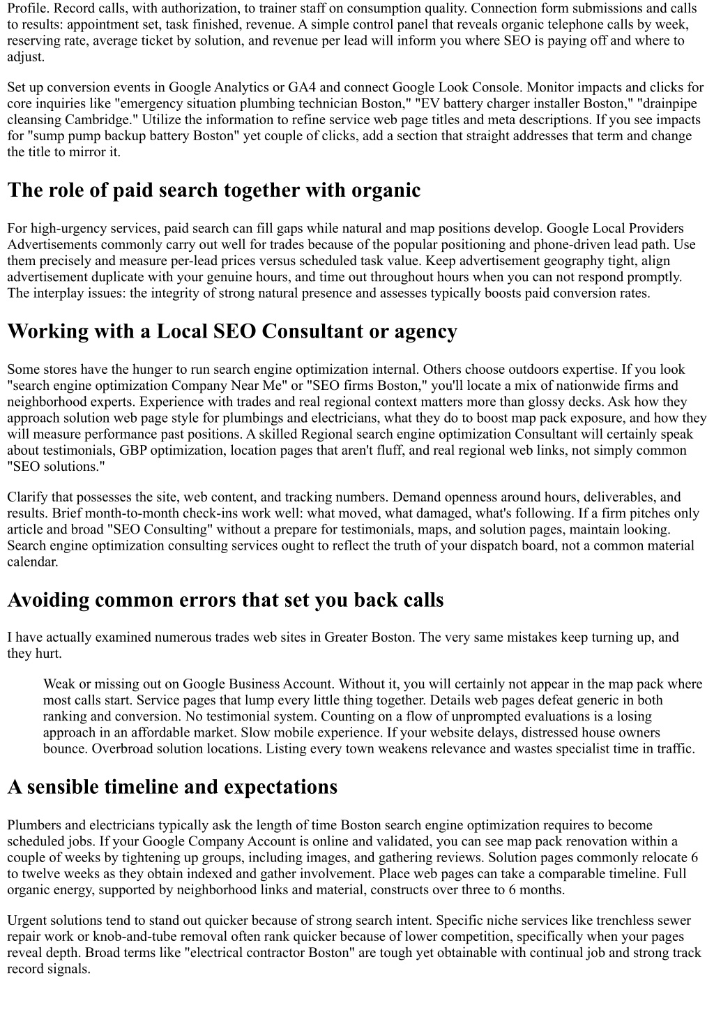 Profile. Record calls, with authorization, to trainer staff on consumption quality. Connection form submissions and calls to results: appointment set, task finished, revenue. A simple control panel that reveals organic telephone calls by week, reserving rate, average ticket by solution, and revenue per lead will inform you where SEO is paying off and where to adjust. Set up conversion events in Google Analytics or GA4 and connect Google Look Console. Monitor impacts and clicks for core inquiries like "emergency situation plumbing technician Boston," "EV battery charger installer Boston," "drainpipe cleansing Cambridge." Utilize the information to refine service web page titles and meta descriptions. If you see impacts for "sump pump backup battery Boston" yet couple of clicks, add a section that straight addresses that term and change the title to mirror it. The role of paid search together with organic For high-urgency services, paid search can fill gaps while natural and map positions develop. Google Local Providers Advertisements commonly carry out well for trades because of the popular positioning and phone-driven lead path. Use them precisely and measure per-lead prices versus scheduled task value. Keep advertisement geography tight, align advertisement duplicate with your genuine hours, and time out throughout hours when you can not respond promptly. The interplay issues: the integrity of strong natural presence and assesses typically boosts paid conversion rates. Working with a Local SEO Consultant or agency Some stores have the hunger to run search engine optimization internal. Others choose outdoors expertise. If you look "search engine optimization Company Near Me" or "SEO firms Boston," you'll locate a mix of nationwide firms and neighborhood experts. Experience with trades and real regional context matters more than glossy decks. Ask how they approach solution web page style for plumbings and electricians, what they do to boost map pack exposure, and how they will measure performance past positions. A skilled Regional search engine optimization Consultant will certainly speak about testimonials, GBP optimization, location pages that aren't fluff, and real regional web links, not simply common "SEO solutions." Clarify that possesses the site, web content, and tracking numbers. Demand openness around hours, deliverables, and results. Brief month-to-month check-ins work well: what moved, what damaged, what's following. If a firm pitches only article and broad "SEO Consulting" without a prepare for testimonials, maps, and solution pages, maintain looking. Search engine optimization consulting services ought to reflect the truth of your dispatch board, not a common material calendar. Avoiding common errors that set you back calls I have actually examined numerous trades web sites in Greater Boston. The very same mistakes keep turning up, and they hurt. Weak or missing out on Google Business Account. Without it, you will certainly not appear in the map pack where most calls start. Service pages that lump every little thing together. Details web pages defeat generic in both ranking and conversion. No testimonial system. Counting on a flow of unprompted evaluations is a losing approach in an affordable market. Slow mobile experience. If your website delays, distressed house owners bounce. Overbroad solution locations. Listing every town weakens relevance and wastes specialist time in traffic. A sensible timeline and expectations Plumbers and electricians typically ask the length of time Boston search engine optimization requires to become scheduled jobs. If your Google Company Account is online and validated, you can see map pack renovation within a couple of weeks by tightening up groups, including images, and gathering reviews. Solution pages commonly relocate 6 to twelve weeks as they obtain indexed and gather involvement. Place web pages can take a comparable timeline. Full organic energy, supported by neighborhood links and material, constructs over three to 6 months. Urgent solutions tend to stand out quicker because of strong search intent. Specific niche services like trenchless sewer repair work or knob-and-tube removal often rank quicker because of lower competition, specifically when your pages reveal depth. Broad terms like "electrical contractor Boston" are tough yet obtainable with continual job and strong track record signals.