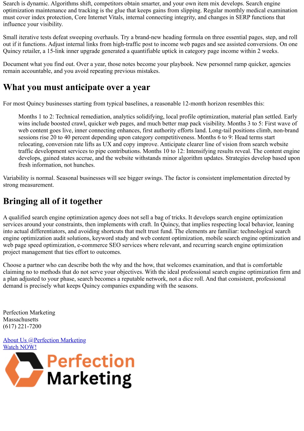 Search is dynamic. Algorithms shift, competitors obtain smarter, and your own item mix develops. Search engine optimization maintenance and tracking is the glue that keeps gains from slipping. Regular monthly medical examination must cover index protection, Core Internet Vitals, internal connecting integrity, and changes in SERP functions that influence your visibility. Small iterative tests defeat sweeping overhauls. Try a brand-new heading formula on three essential pages, step, and roll out if it functions. Adjust internal links from high-traffic post to income web pages and see assisted conversions. On one Quincy retailer, a 15-link inner upgrade generated a quantifiable uptick in category page income within 2 weeks. Document what you find out. Over a year, those notes become your playbook. New personnel ramp quicker, agencies remain accountable, and you avoid repeating previous mistakes. What you must anticipate over a year For most Quincy businesses starting from typical baselines, a reasonable 12-month horizon resembles this: Months 1 to 2: Technical remediation, analytics solidifying, local profile optimization, material plan settled. Early wins include boosted crawl, quicker web pages, and much better map pack visibility. Months 3 to 5: First wave of web content goes live, inner connecting enhances, first authority efforts land. Long-tail positions climb, non-brand sessions rise 20 to 40 percent depending upon category competitiveness. Months 6 to 9: Head terms start relocating, conversion rate lifts as UX and copy improve. Anticipate clearer line of vision from search website traffic development services to pipe contributions. Months 10 to 12: Intensifying results reveal. The content engine develops, gained states accrue, and the website withstands minor algorithm updates. Strategies develop based upon fresh information, not hunches. Variability is normal. Seasonal businesses will see bigger swings. The factor is consistent implementation directed by strong measurement. Bringing all of it together A qualified search engine optimization agency does not sell a bag of tricks. It develops search engine optimization services around your constraints, then implements with craft. In Quincy, that implies respecting local behavior, leaning into actual differentiators, and avoiding shortcuts that melt trust fund. The elements are familiar: technological search engine optimization audit solutions, keyword study and web content optimization, mobile search engine optimization and web page speed optimization, e‑commerce SEO services where relevant, and recurring search engine optimization project management that ties effort to outcomes. Choose a partner who can describe both the why and the how, that welcomes examination, and that is comfortable claiming no to methods that do not serve your objectives. With the ideal professional search engine optimization firm and a plan adjusted to your phase, search becomes a reputable network, not a dice roll. And that consistent, professional demand is precisely what keeps Quincy companies expanding with the seasons. Perfection Marketing Massachusetts (617) 221-7200 About Us @Perfection Marketing Watch NOW!