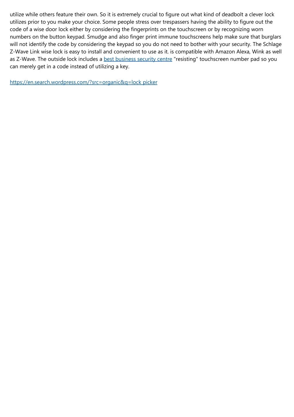 utilize while others feature their own. So it is extremely crucial to figure out what kind of deadbolt a clever lock utilizes prior to you make your choice. Some people stress over trespassers having the ability to figure out the code of a wise door lock either by considering the fingerprints on the touchscreen or by recognizing worn numbers on the button keypad. Smudge and also finger print immune touchscreens help make sure that burglars will not identify the code by considering the keypad so you do not need to bother with your security. The Schlage Z-Wave Link wise lock is easy to install and convenient to use as it. is compatible with Amazon Alexa, Wink as well as Z-Wave. The outside lock includes a best business security centre "resisting" touchscreen number pad so you can merely get in a code instead of utilizing a key. https://en.search.wordpress.com/?src=organic&q=lock picker