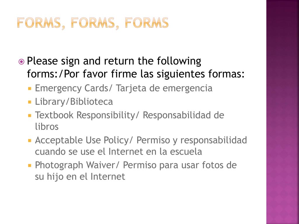 Forms, Forms, Forms • Please sign and return the following forms:/Por favor firmelassiguientesformas: • Emergency Cards/ Tarjeta de emergencia • Library/Biblioteca • Textbook Responsibility/ Responsabilidad de libros • Acceptable Use Policy/ Permiso y responsabilidadcuando se use el Internet en la escuela • Photograph Waiver/ Permisoparausarfotos de suhijo en el Internet