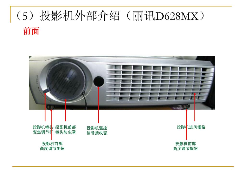 (5)投影机外部介绍(丽讯D628MX) 前面 投影机镜头变焦调节杆 投影机前部镜头防尘罩 投影机进风栅格 投影机遥控信号接收窗 投影机前部高度调节旋钮 投影机前部高度调节旋钮