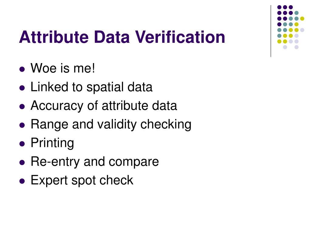 Attribute Data Verification • Woe is me! • Linked to spatial data • Accuracy of attribute data • Range and validity checking • Printing • Re-entry and compare • Expert spot check