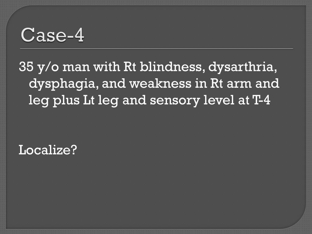 Case-4 35 y/o man with Rt blindness, dysarthria, dysphagia, and weakness in Rt arm and leg plus Lt leg and sensory level at T-4 Localize?