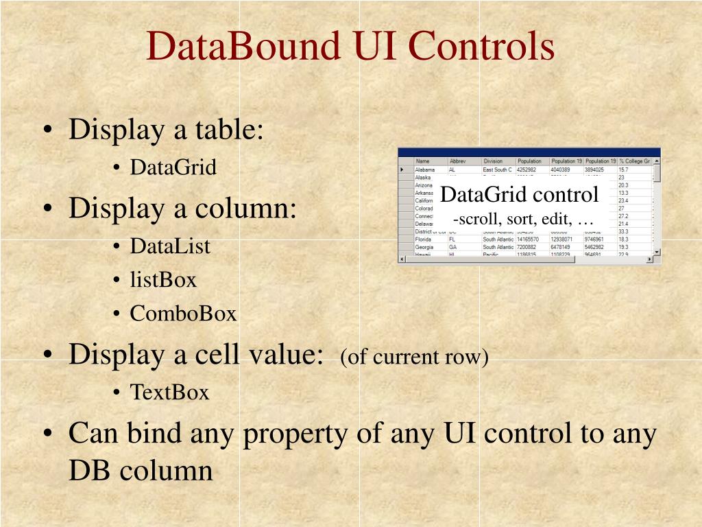 DataBound UI Controls • Display a table: • DataGrid • Display a column: • DataList • listBox • ComboBox • Display a cell value: (of current row) • TextBox • Can bind any property of any UI control to any DB column DataGrid control -scroll, sort, edit, …