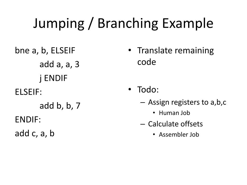 Jumping / Branching Example bne a, b, ELSEIF add a, a, 3 j ENDIF ELSEIF: add b, b, 7 ENDIF: add c, a, b • Translate remaining code • Todo: • Assign registers to a,b,c • Human Job • Calculate offsets • Assembler Job