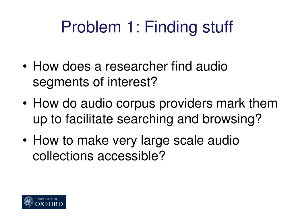Problem 1: Finding stuff • How does a researcher find audio segments of interest? • How do audio corpus providers mark them up to facilitate searching and browsing? • How to make very large scale audio collections accessible?