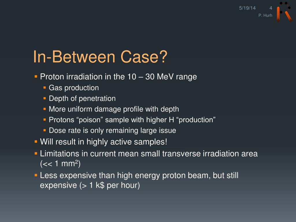 P. Hurh In-Between Case? • Proton irradiation in the 10 – 30 MeV range • Gas production • Depth of penetration • More uniform damage profile with depth • Protons “poison” sample with higher H “production” • Dose rate is only remaining large issue • Will result in highly active samples! • Limitations in current mean small transverse irradiation area (<< 1 mm2) • Less expensive than high energy proton beam, but still expensive (> 1 k$ per hour)