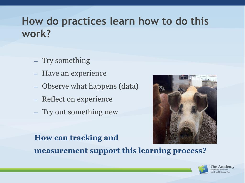 How do practices learn how to do this work? • Try something • Have an experience • Observe what happens (data) • Reflect on experience • Try out something new How can tracking and measurement support this learning process?