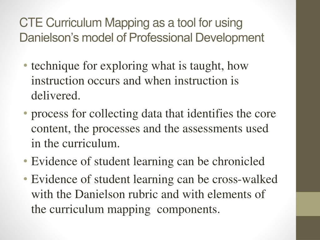 CTE Curriculum Mapping as a tool for using Danielson’s model of Professional Development • technique for exploring what is taught, how instruction occurs and when instruction is delivered. • process for collecting data that identifies the core content, the processes and the assessments used in the curriculum. • Evidence of student learning can be chronicled • Evidence of student learning can be cross-walked with the Danielson rubric and with elements of the curriculum mapping components.