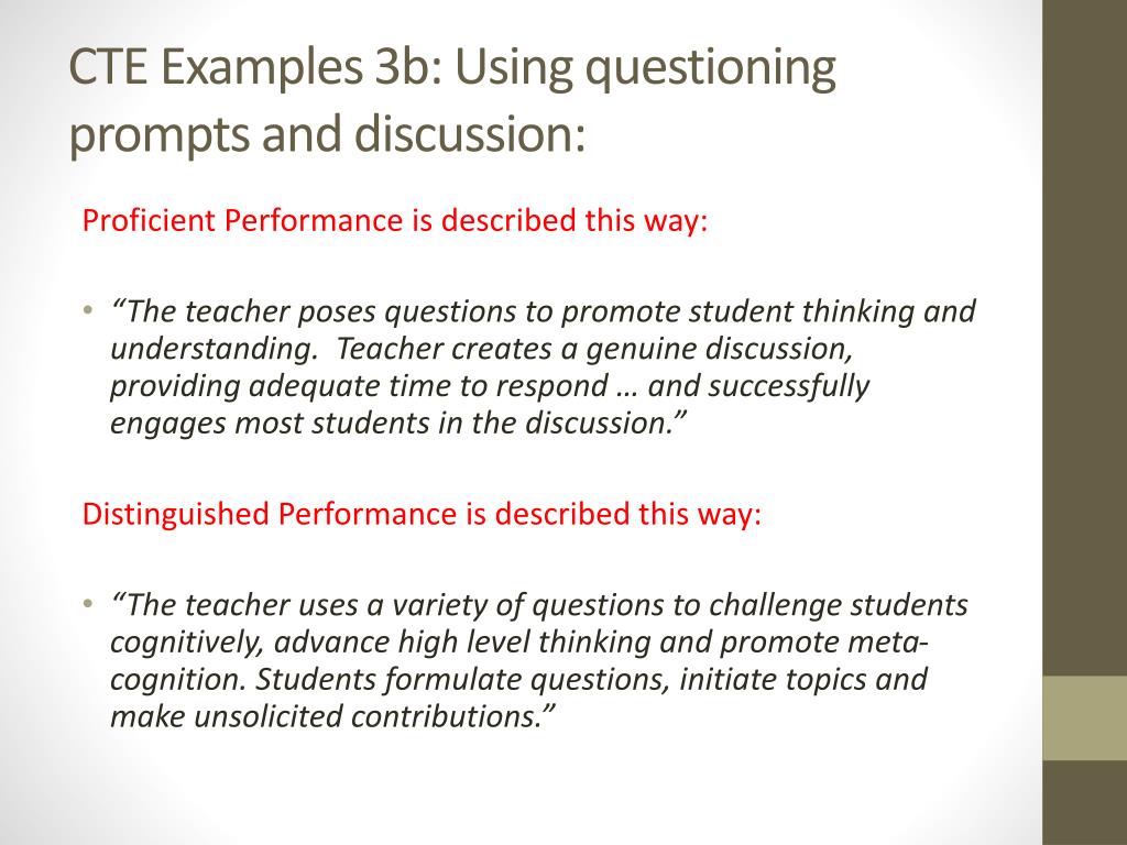 CTE Examples 3b: Using questioning prompts and discussion: Proficient Performance is described this way: • “The teacher poses questions to promote student thinking and understanding. Teacher creates a genuine discussion, providing adequate time to respond … and successfully engages most students in the discussion.” Distinguished Performance is described this way: • “The teacher uses a variety of questions to challenge students cognitively, advance high level thinking and promote meta-cognition. Students formulate questions, initiate topics and make unsolicited contributions.”