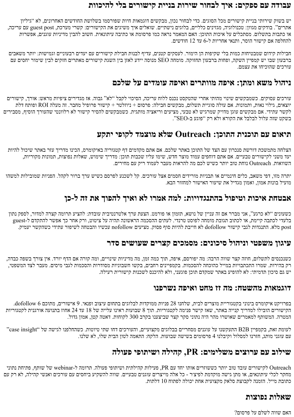 תווכיהל ילב םירושיק תיינב תוריש רוחבל ךיא :םיקפס םע הדובע ןויליג“ אל ,םינורחאה םישדוחה תשולשב ומסרופש תויח תואמגוד םישקבמ ,ןוכנ רוחבל ידכ .םיגוסה לכמ םירושיק תיינב יתוריש קושב שי ,הכירע םע guest post ,תכרעמ ירשק :םירושיקה תא םיגישמ ךיא םילאוש .םייתשינ םיגולב ,םייללכ םיניזגמ ,היגולונכט :ןווגמ םיקדוב .”םירתא תורשפא ,םינגוע תוינידמ ןיבהל בושח .תיאנותיע הביתכ וא תמוסרפ ומכ הארנ רמאמה םאה :ןכותה תוכיא לע םילכתסמ .םולשתב תובתכ וא .םישדוח 12 דע 6-ל תוירחא יאנתו ,רסוה רושיק םא הפלחהל םיבאשמ רתוי :תושימגו םיינועבר םידעי םע םירושיק תליבח תונבל ףידע ,םינטק םיקסעל .רומיה ןה תופיקש ילב תומכ תוחיטבמש םודיק תוליבח םע םיסחי רומיש ןיבל םיקזח םירתאמ םירושיק תגשה ןיב ןזאל עדיי הסונמ SEO החמומ .הקוזחת ןועברב תוחפו ,הקשה ןייפמק שי ובש ןועברב .םמצע תא וחיכוהש םיכרוע םכלש לע םידמוע הפיאו םירתוומ הפיא :ןתמו אשמ לוהינ םירושיק ,ךרוא :שארמ תויפיצ םירידגמ זא .הובג ”אל“ לבקל יוכיסה ,הכירע חולל סנכנ טסקטהש ירחא יתוהמ יוניש םישקבמשכ .םיקוסע םיכרוע תלד חתופו ROI הלעמ הז .רבחמ ליפורפ רושיק + רטלזוינ + םוסרפ :הליבח םישקבמ ,םולשת תייגוס הלוע םא .תונומתו ,תואנ יוליג ,םיאצוי םיריבסמ ,ףיסוה ךרועהש יטנוולר אל רושיק ריסהל םישקבמשכ .תיגתומ היצאירו םיעיצמ ,יעבט אל שיגרמש קיודמ ןגוע םישקבמ םא .ידיתע רשקל .”SEO-ב עגופ“ קר אלו ארוקה תא לבלבל לולע הזש טקשב עקתי יפוקל דמצומ אלש Outreach :ןכותה תינכות םע םואית תויהל לוכיש רתאב רזע ךירדמ וניכה ,סרמוקיאב הירוגטק ףד םימדקמ םתא םא .םכלש רתאב ןכותה לש דצה םע ןורכנס תשרוד תכשמתמ החלצה ,תוירוקמ תונומת ,תוצופנ תולאש ,שומיש ךירדמ :ןכות תובכש וילע ומיש ,שדח רצומ דומע םיפחוד םתא םא .םייעבט םירושיקל ינשמ דעי .םיריחמ םע קיר דומעל רבעמ תוארהל המ םכל שישכ רתוי בוט תחונ Outreach .תואוושה והשמל תוליבומש תוינפה .להקל רורב ךרע שישכ םסרפל ענכשל לק .םיכרוע לצא םימסח םידירומ תוינבת וא םיימניח םילכ ,באשמ יפד ,וזמ הרתי .אבה רוזחמל רושיאה רועיש תא לידגמ ןומאו ,ןומא תונוב ליעומ ןכ-ל הז תא ךופהל ךיאו אל ורמא המל :תויודגנתהב לופיטו תוכיא תחטבא ןותנ קפסל ,רודמל הרצק המורת עיצהל :תדבוע תיביטנרטלא ךרע תעצה .טמרופ וא ןומזת ,אשונ לש ןיינע הז םא ררבמ ינא ,”עגרכ אל“ םינועשכ guest-ל םדקתהל רשפא ךכ רחא קרו ,טוטיצ לע היהת הנושארה המכסהה םיתעל .ידנרט טסופל החמומ תבוגת בותכל וא ,תמייק הבתכל ידעלב .קימעי רשקהשכ ידיתע רופישל החטבהו וישכע nofollow םיעיצמ .קוספ ףוס תויהל תבייח אל dofollow רושיק יבגל תודגנתה .אלמ post רדס םישועש םירצק םיכמסמ :םינוכיס לוהינו יטפשמ ןוגיע ,הדבכ הפשב ךרוצ ןיא .דרוי ףדה םא הרוק המו ,םייוניש תוינידמ המ ,ןמז המכ ךות ,הפיא ,םסרופי המ :הברה הווש רצק הזוח ,םולשתל םיסנכנשכ ,יטפשמה דצל רבעמ .םיסימ יבגל תומכסהו תורדוסמ תוינובשח ושקב ,םיבחר םינייפמקב .תומכסהל החכוהכ ליימב תויובתכתה ורמש .תוריהב קר .הליער תירושיק תונכשל סנכיהל אלו ,ינעגופ ןכות םדקמש רתאב עיפוהל אל :יתימדת ןוכיס םג שי ונפרשנ הפיאו טחמ זז המ :חטשהמ תואמגוד .dofollow 6 םכותמ ,םירושיא 9 .יאנפו בוציע םוחתב םיגולבל תודקוממ תוינפ 28 ונחלש ,תיבל םירצומ תיירוגטקב ינוניב סרמוקיא טקיורפב תוירוגטקל תינגרוא העונתב זוחא 24 דע 18 לש היילע וניאר תועובש 8 ךות .תוירוגטקל המינפ רשיק זאש ,רתאב היינק ךירדמל וליבוה םירושיקה .לודג ןומא ,ןטק הטאד .תוחוקל 300 ברקב ונעציבש רצק רקס ינותנ היה רהמ ורשואש םירמאמל ףתושמה .הרטמה ”case insight“ לש השיגל ונפלחהשכ .תוטויט יתש וחד םיכרועהו ,םייעוצקמ םיגולבב םיירחסמ םינגוע לע ונשקעתה B2B ןייפמקב ,תאז תמועל .ונלש אל ,ולש תיבה ןוטל המאתה :חקלה .תועובש השישב םימוסרפ 4 ונלביקו לולסמל ונרזח ,גתומ ינגוע םע הלועפ יפותישו הליהק ,PR :םימילשמ םיצורע םע בוליש ינותנ תחיתפ ,ףתוש לש webinar-ל המורת .הלועפ יפותישו תיתליהק תוליעפ ,PR םע דחי ותוא םירזוששכ רתוי בוט דבוע םירושיקל Outreach םע קר אל 