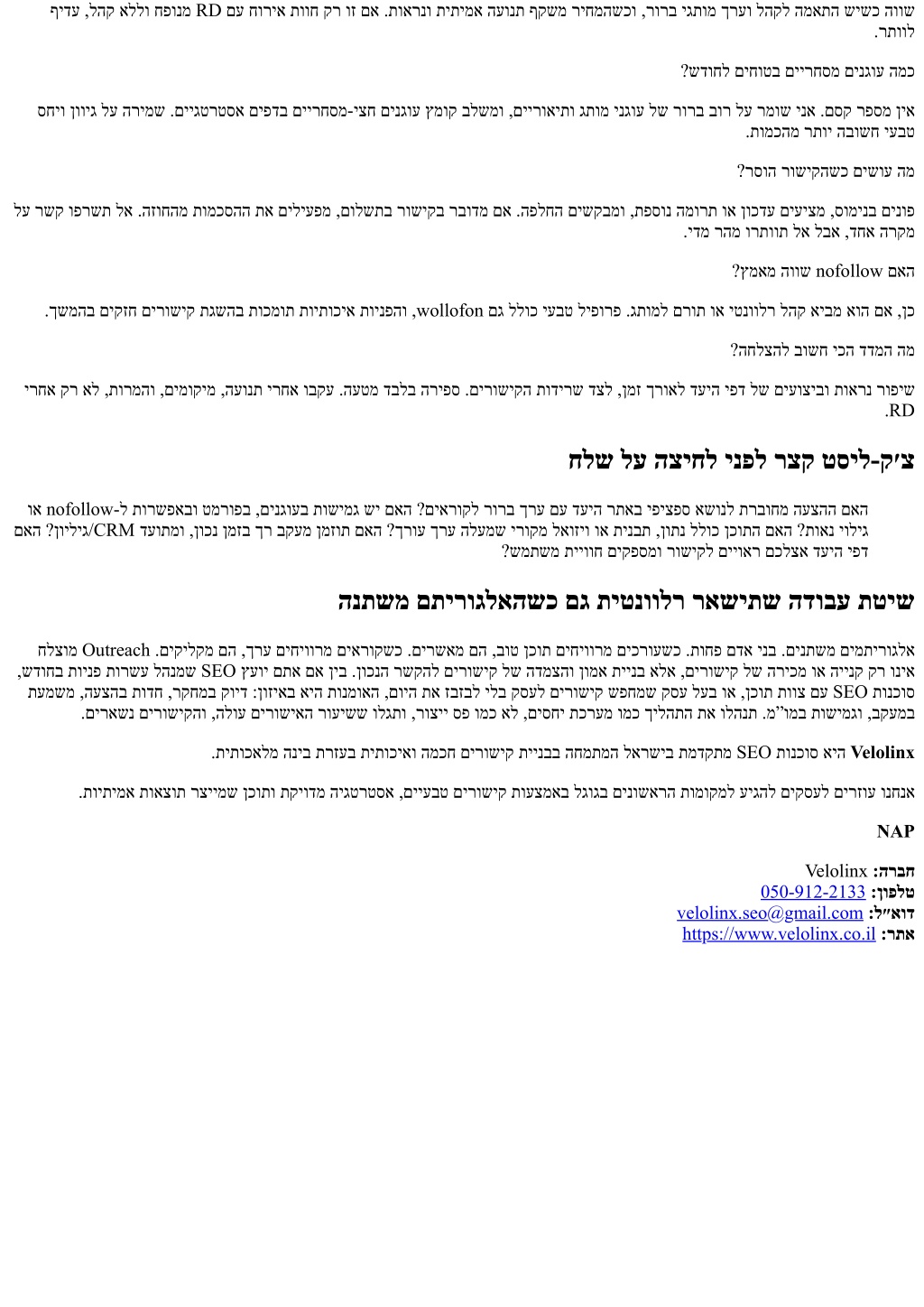ףידע ,להק אללו חפונמ RD םע חוריא תווח קר וז םא .תוארנו תיתימא העונת ףקשמ ריחמהשכו ,רורב יגתומ ךרעו להקל המאתה שישכ הווש .רתוול ?שדוחל םיחוטב םיירחסמ םינגוע המכ סחיו ןוויג לע הרימש .םייגטרטסא םיפדב םיירחסמ-יצח םינגוע ץמוק בלשמו ,םיירואיתו גתומ ינגוע לש רורב בור לע רמוש ינא .םסק רפסמ ןיא .תומכהמ רתוי הבושח יעבט ?רסוה רושיקהשכ םישוע המ לע רשק ופרשת לא .הזוחהמ תומכסהה תא םיליעפמ ,םולשתב רושיקב רבודמ םא .הפלחה םישקבמו ,תפסונ המורת וא ןוכדע םיעיצמ ,סומינב םינופ .ידמ רהמ ורתוות לא לבא ,דחא הרקמ ?ץמאמ הווש nofollow םאה .ךשמהב םיקזח םירושיק תגשהב תוכמות תויתוכיא תוינפהו ,wollofon םג ללוכ יעבט ליפורפ .גתומל םרות וא יטנוולר להק איבמ אוה םא ,ןכ ?החלצהל בושח יכה דדמה המ ירחא קר אל ,תורמהו ,םימוקימ ,העונת ירחא ובקע .העטמ דבלב הריפס .םירושיקה תודירש דצל ,ןמז ךרואל דעיה יפד לש םיעוציבו תוארנ רופיש .RD חלש לע הציחל ינפל רצק טסיל-ק׳צ וא nofollow-ל תורשפאבו טמרופב ,םינגועב תושימג שי םאה ?םיארוקל רורב ךרע םע דעיה רתאב יפיצפס אשונל תרבוחמ העצהה םאה םאה ?ןויליג/CRM דעותמו ,ןוכנ ןמזב ךר בקעמ ןמזות םאה ?ךרוע ךרע הלעמש ירוקמ לאוזיו וא תינבת ,ןותנ ללוכ ןכותה םאה ?תואנ יוליג ?שמתשמ תייווח םיקפסמו רושיקל םייואר םכלצא דעיה יפד הנתשמ םתירוגלאהשכ םג תיטנוולר ראשיתש הדובע תטיש חלצומ Outreach .םיקילקמ םה ,ךרע םיחיוורמ םיארוקשכ .םירשאמ םה ,בוט ןכות םיחיוורמ םיכרועשכ .תוחפ םדא ינב .םינתשמ םימתירוגלא ,שדוחב תוינפ תורשע להנמש SEO ץעוי םתא םא ןיב .ןוכנה רשקהל םירושיק לש הדמצהו ןומא תיינב אלא ,םירושיק לש הריכמ וא היינק קר וניא תעמשמ ,העצהב תודח ,רקחמב קויד :ןוזיאב איה תונמואה ,םויה תא זבזבל ילב קסעל םירושיק שפחמש קסע לעב וא ,ןכות תווצ םע SEO תונכוס .םיראשנ םירושיקהו ,הלוע םירושיאה רועישש ולגתו ,רוציי ספ ומכ אל ,םיסחי תכרעמ ומכ ךילהתה תא ולהנת .מ”ומב תושימגו ,בקעמב .תיתוכאלמ הניב תרזעב תיתוכיאו המכח םירושיק תיינבב החמתמה לארשיב תמדקתמ SEO תונכוס איה Velolinx .תויתימא תואצות רציימש ןכותו תקיודמ היגטרטסא ,םייעבט םירושיק תועצמאב לגוגב םינושארה תומוקמל עיגהל םיקסעל םירזוע ונחנא NAP Velolinx :הרבח 050-912-2133:ןופלט velolinx.seo@gmail.com:ל״אוד https://www.velolinx.co.il:רתא
