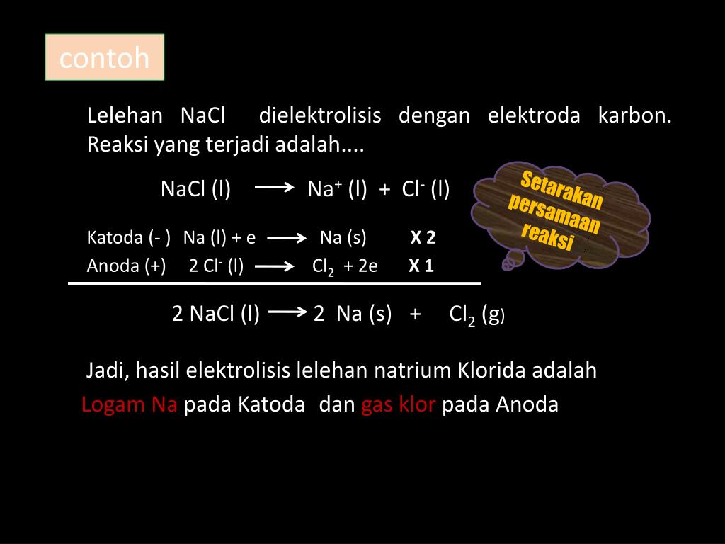 contoh Lelehan NaCl dielektrolisis dengan elektroda karbon. Reaksi yang terjadi adalah.... Setarakan persamaan reaksi NaCl (l) Na+ (l) + Cl- (l) Katoda (- ) Na (l) + e Na (s) X 2 Anoda (+) 2 Cl- (l) Cl2 + 2e X 1 2 NaCl (l) 2 Na (s) + Cl2 (g) Jadi, hasil elektrolisis lelehan natrium Klorida adalah Logam Na pada Katoda dan gas klor pada Anoda