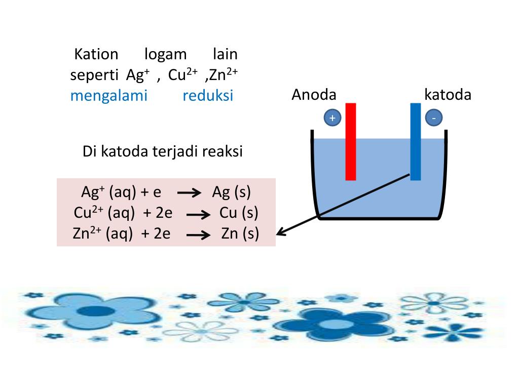 Kation logam lain seperti Ag+ , Cu2+ ,Zn2+mengalami reduksi Anoda katoda + - Di katoda terjadi reaksi Ag+ (aq) + e Ag (s) Cu2+ (aq) + 2e Cu (s) Zn2+ (aq) + 2e Zn (s)