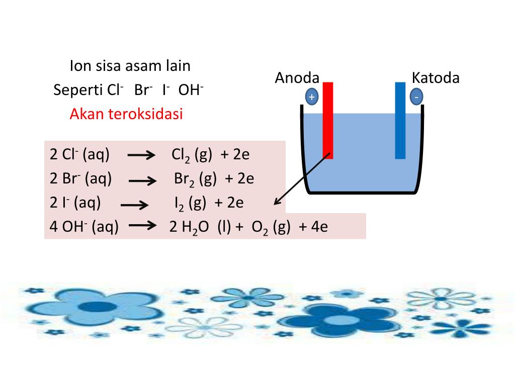 Ion sisa asam lain Anoda Katoda Seperti Cl- Br- I- OH- + - Akan teroksidasi 2 Cl- (aq) Cl2 (g) + 2e 2 Br- (aq) Br2 (g) + 2e 2 I- (aq) I2 (g) + 2e 4 OH- (aq) 2 H2O (l) + O2 (g) + 4e