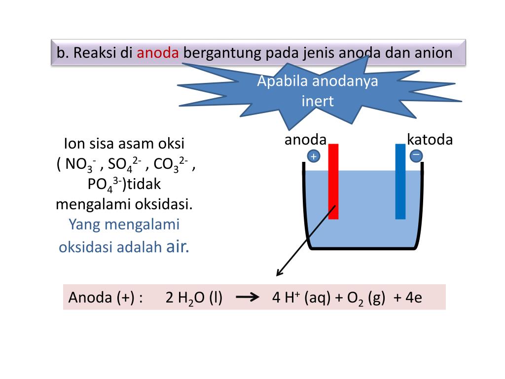 b. Reaksi di anoda bergantung pada jenis anoda dan anion Apabila anodanya inert anoda katoda Ion sisa asam oksi ( NO3- , SO42- , CO32- , PO43-)tidak mengalami oksidasi. Yang mengalami oksidasi adalah air. + _- Anoda (+) : 2 H2O (l) 4 H+ (aq) + O2 (g) + 4e