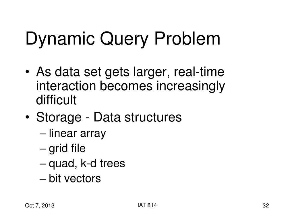 Dynamic Query Problem • As data set gets larger, real-time interaction becomes increasingly difficult • Storage - Data structures • linear array • grid file • quad, k-d trees • bit vectors IAT 814