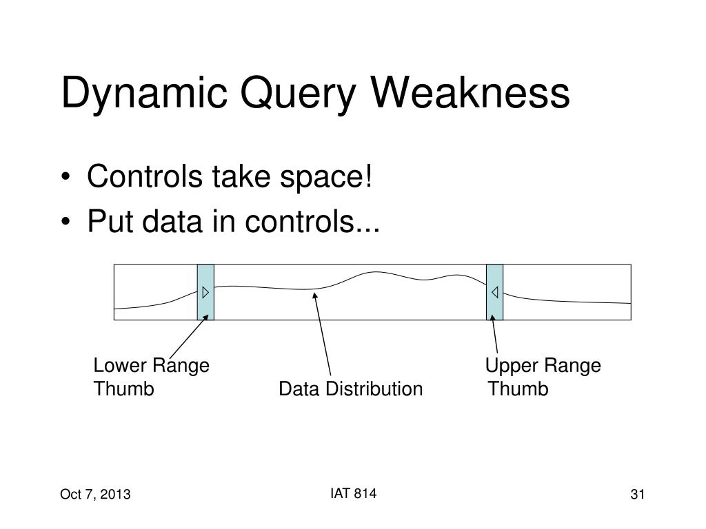 Dynamic Query Weakness • Controls take space! • Put data in controls... Lower Range Upper Range Thumb Data Distribution Thumb IAT 814