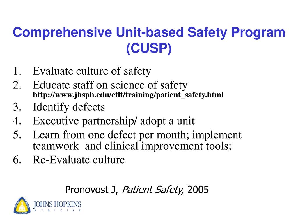 Comprehensive Unit-based Safety Program (CUSP) • Evaluate culture of safety • Educate staff on science of safety http://www.jhsph.edu/ctlt/training/patient_safety.html • Identify defects • Executive partnership/ adopt a unit • Learn from one defect per month; implement teamwork and clinical improvement tools; • Re-Evaluate culture Pronovost J, Patient Safety, 2005