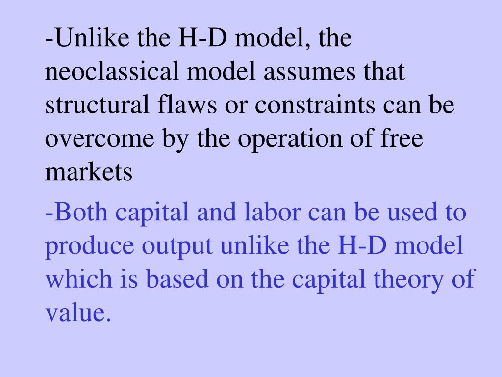 -Unlike the H-D model, the neoclassical model assumes that structural flaws or constraints can be overcome by the operation of free markets -Both capital and labor can be used to produce output unlike the H-D model which is based on the capital theory of value.