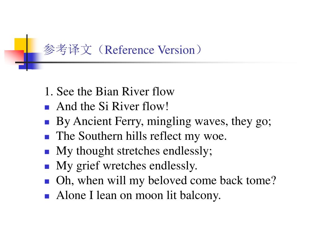 参考译文(Reference Version) 1. See the Bian River flow • And the Si River flow! • By Ancient Ferry, mingling waves, they go; • The Southern hills reflect my woe. • My thought stretches endlessly; • My grief wretches endlessly. • Oh, when will my beloved come back tome? • Alone I lean on moon lit balcony.