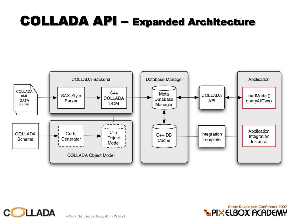 Assets script App. data COLLADA COLLADA Model DCC tools Import/Export Fast Path Viewer 3rd party tools Schema Validation Refinery Conversion Final asset Application Grey parts provided by COLLADA