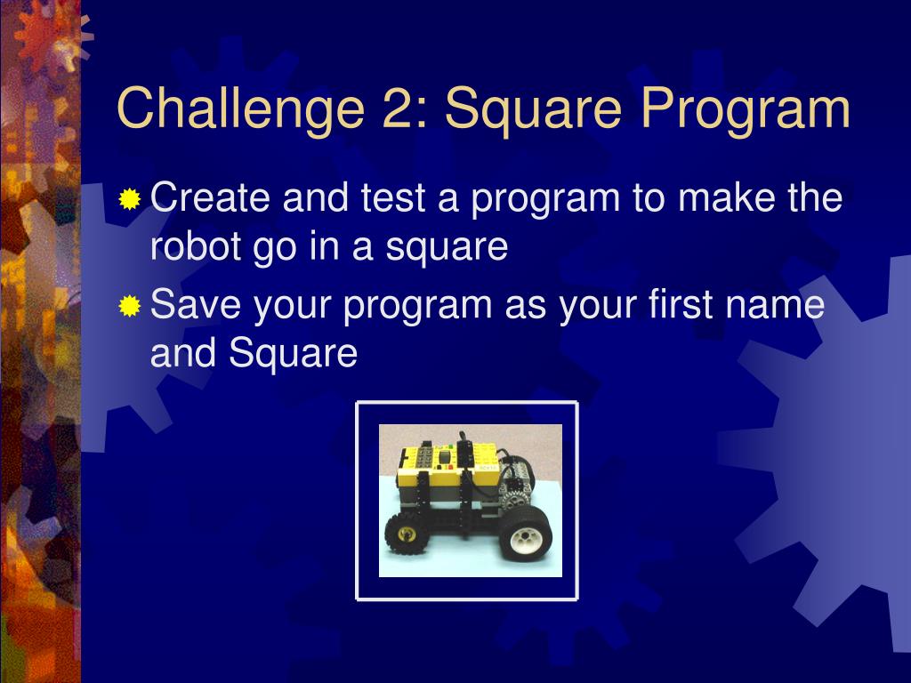 Challenge 2: Square Program • Create and test a program to make the robot go in a square • Save your program as your first name and Square