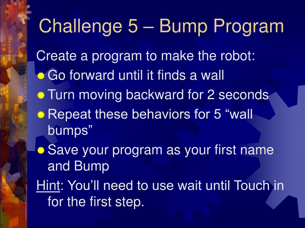 Challenge 5 – Bump Program Create a program to make the robot: • Go forward until it finds a wall • Turn moving backward for 2 seconds • Repeat these behaviors for 5 “wall bumps” • Save your program as your first name and Bump Hint: You’ll need to use wait until Touch in for the first step.