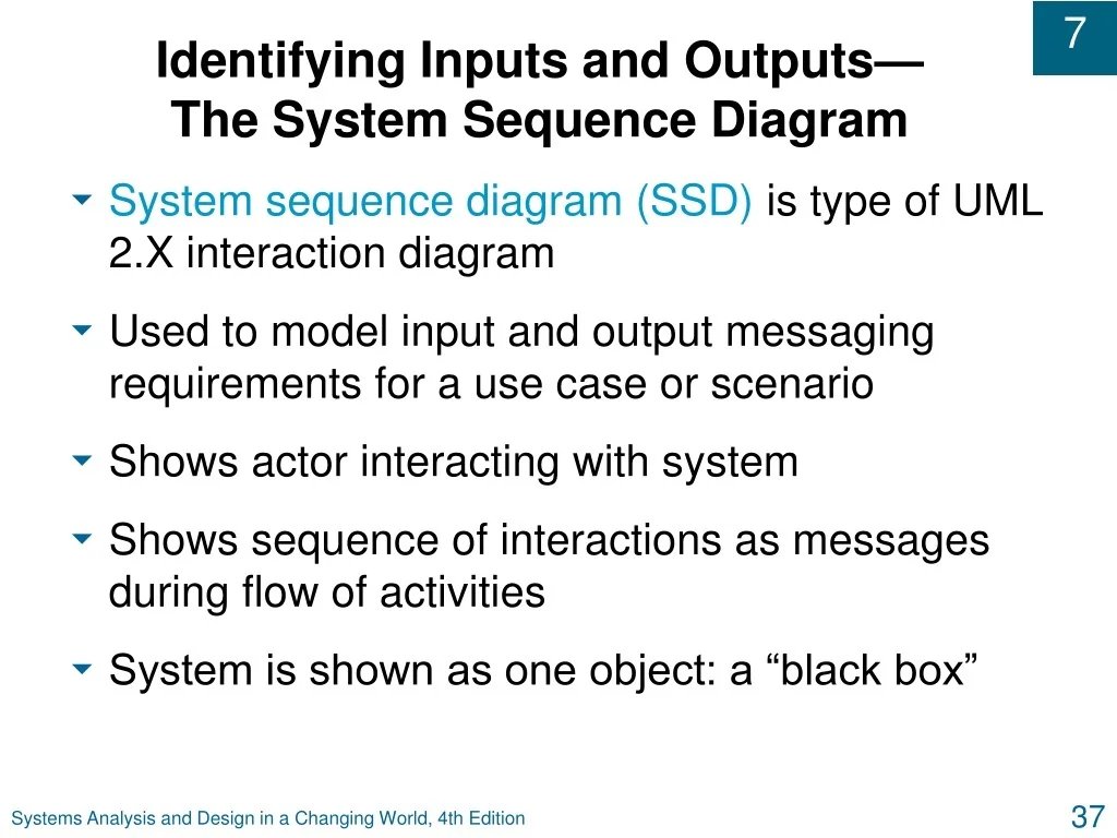 Identifying Inputs and Outputs—The System Sequence Diagram • System sequence diagram (SSD) is type of UML 2.X interaction diagram • Used to model input and output messaging requirements for a use case or scenario • Shows actor interacting with system • Shows sequence of interactions as messages during flow of activities • System is shown as one object: a “black box” Systems Analysis and Design in a Changing World, 4th Edition