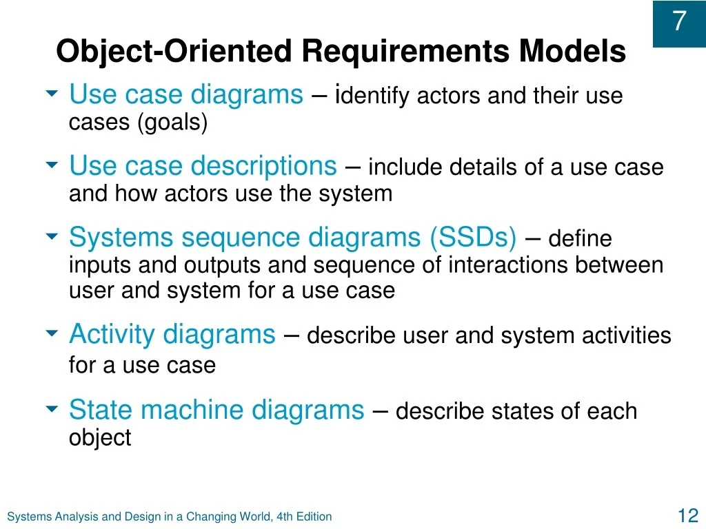 Object-Oriented Requirements Models • Use case diagrams – identify actors and their use cases (goals) • Use case descriptions – include details of a use case and how actors use the system • Systems sequence diagrams (SSDs) – define inputs and outputs and sequence of interactions between user and system for a use case • Activity diagrams – describe user and system activities for a use case • State machine diagrams – describe states of each object Systems Analysis and Design in a Changing World, 4th Edition