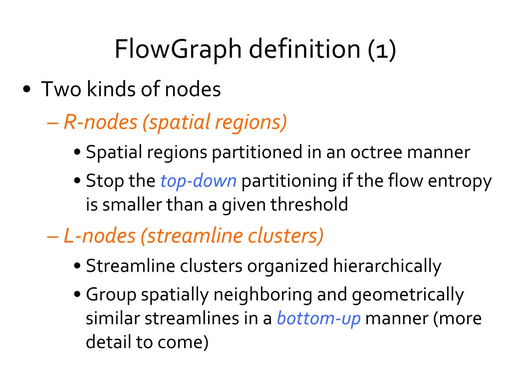 Two kinds of nodes R-nodes (spatial regions) Spatial regions partitioned in an octree manner Stop the top-down partitioning if the flow entropy is smaller than a given threshold L-nodes (streamline clusters) Streamline clusters organized hierarchically Group spatially neighboring and geometrically similar streamlines in a bottom-up manner (more detail to come) FlowGraph definition (1)