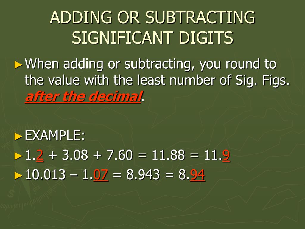 ADDING OR SUBTRACTINGSIGNIFICANT DIGITS • When adding or subtracting, you round to the value with the least number of Sig. Figs. after the decimal. • EXAMPLE: • 1.2 + 3.08 + 7.60 = 11.88 = 11.9 • 10.013 – 1.07 = 8.943 = 8.94