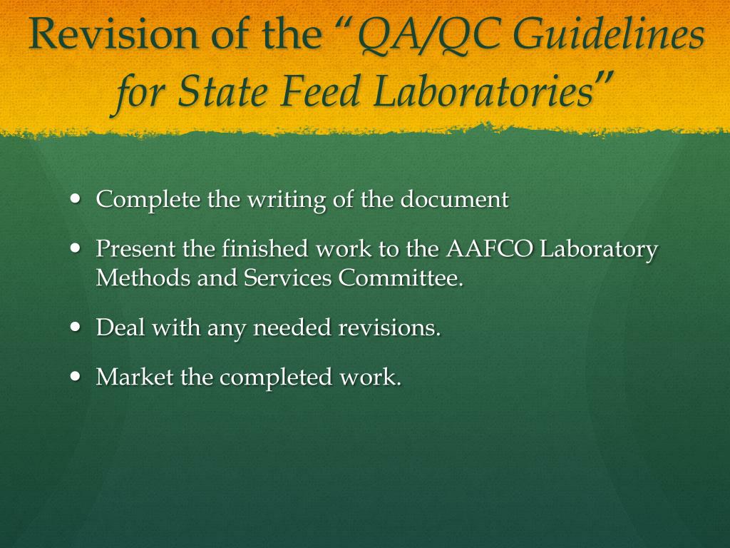 Revision of the “QA/QC Guidelines for State Feed Laboratories” • Complete the writing of the document • Present the finished work to the AAFCO Laboratory Methods and Services Committee. • Deal with any needed revisions. • Market the completed work.